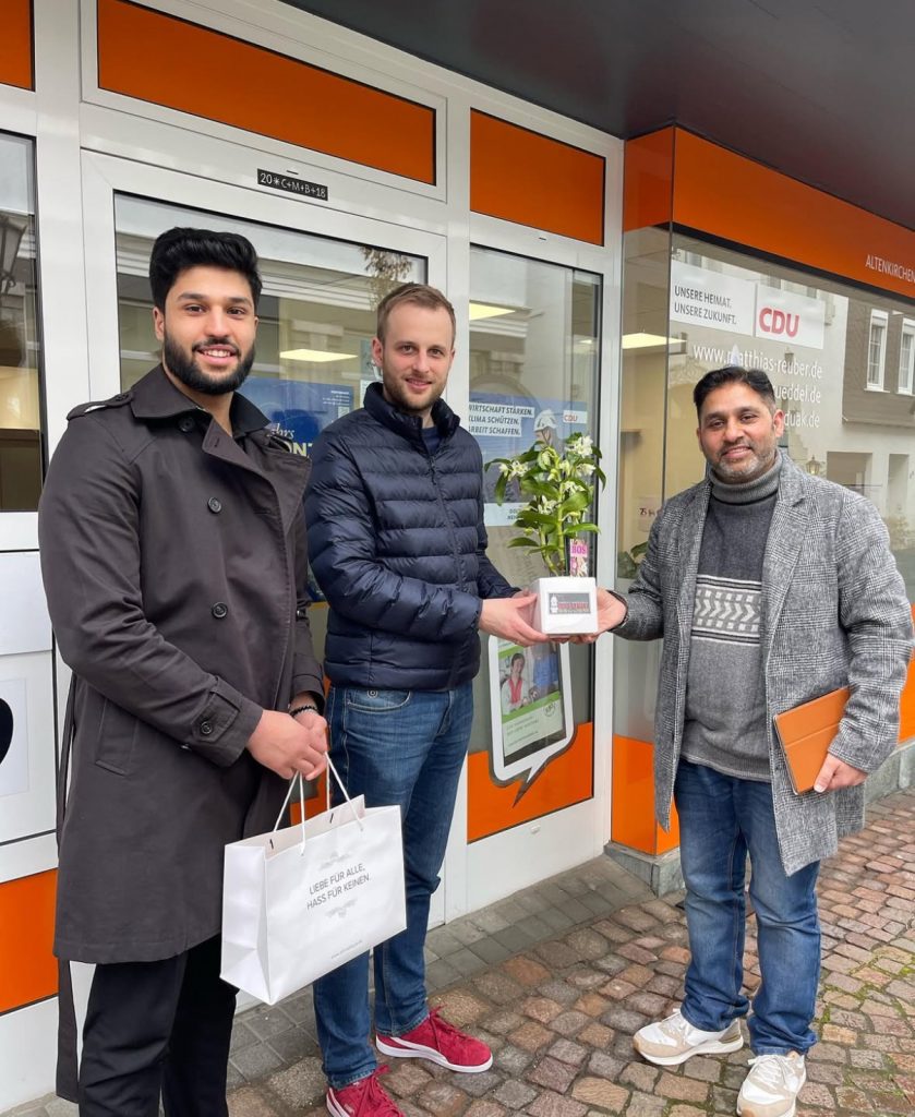 Besonders bewegend war der Austausch über die schwierige Situation, in der sich viele Ahmadis befinden – viele von ihnen sehen sich gezwungen, aufgrund religiöser Verfolgung ihr geliebtes Heimatland zu verlassen. Herr Dr. Reuber zeigte sich tief betroffen und überrascht über das Ausmaß der Diskriminierung, die Mitglieder der Gemeinde dort erleben müssen.