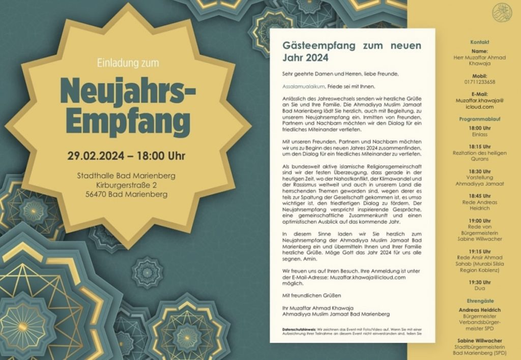 Vielen Dank an alle Gäste, die gestern beim Neujahrsempfang der Ahmadiyya Muslim Gemeinde Bad Marienberg dabei waren! Euer Engagement und eure Unterstützung haben diesen Abend zu einem unvergesslichen Ereignis gemacht. Wir freuen uns schon auf das nächste Mal!